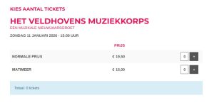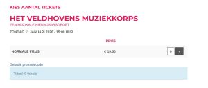 Druk op de knop TICKETS, en vervolgens kom je op de geselecteerde voorstellingspagina terecht (in dit geval als voorbeeld het Veldhovens Muziekkorps, maar dat kan dus ook een andere voorstellingspagina zijn):